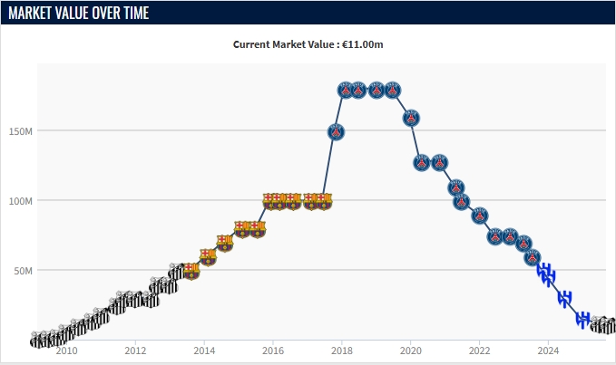 Người thứ ba trong quá khứ! Giá trị ròng 33 tuổi của Neymar đã giảm xuống còn 11 triệu euro, trong khi 100 triệu euro của Melo có giá trị ở cùng độ tuổi.